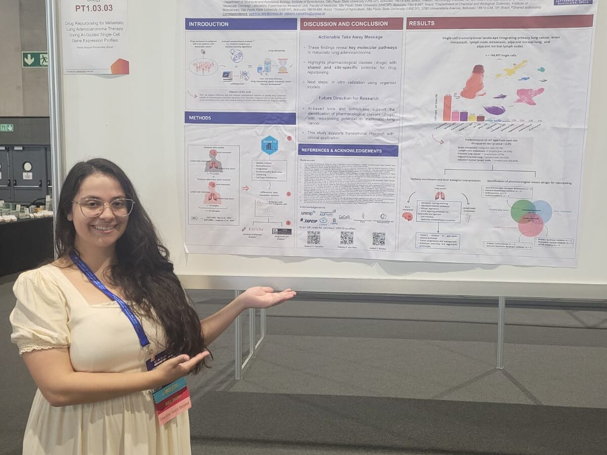 A doutoranda Maria Raquel Gomes Fernandes, do Programa de Pós-Graduação em Ciências Biológicas (Genética) do Instituto de Biociências da Unesp, em Botucatu, conquistou o Developing Country Education Award, um dos reconhecimentos mais disputados da World Conference on Lung Cancer (WCLC 2025), promovida pela International Association for the Study of Lung Cancer (IASLC), realizada entre 6 e 9 de setembro, em Barcelona, Espanha. O prêmio, concedido a jovens pesquisadores de países em desenvolvimento, garantiu suporte para sua participação no maior evento mundial dedicado ao câncer de pulmão.