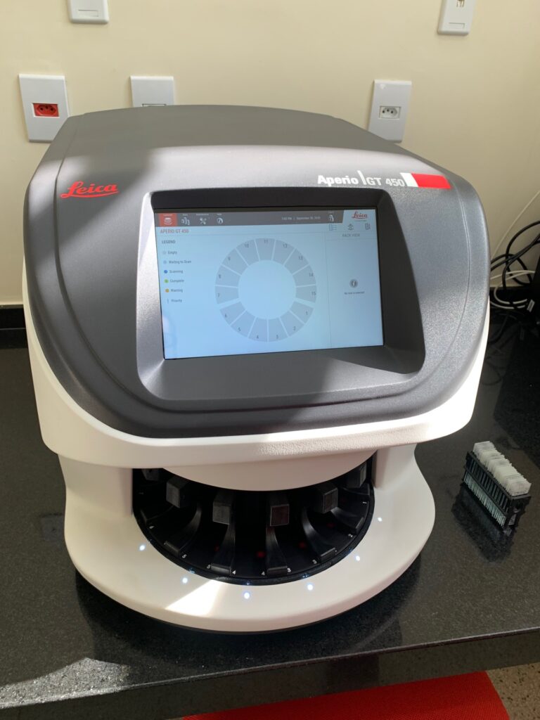 Equipamento digitaliza lâminas de tecidos (histológicas) e as transforma em imagens de alta resolução que podem ser visualizadas em um computador, tablete ou celular, utilizando um software especializado, e armazenadas digitalmente