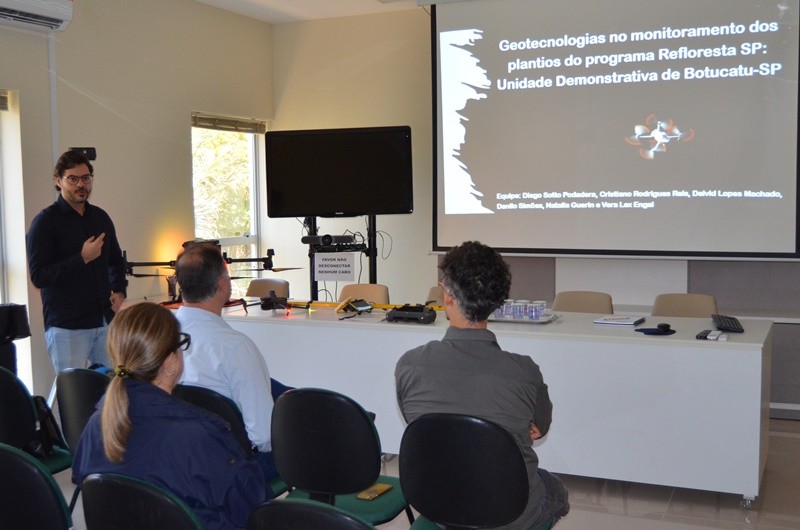 Durante o encontro, o professor Diego realizou uma apresentação institucional do projeto. Na sequencia, o professor Cristiano Rodrigues Reis fez uma apresentação sobre o uso de geotecnologias no monitoramento dos plantios do programa Refloresta SP.
