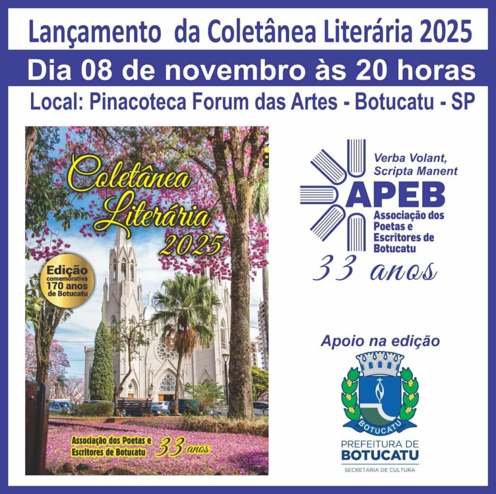 A Associação dos Poetas e Escritores de Botucatu (APEB), lança sábado, dia 8 de novembro, às 20 horas, no Fórum das Artes da Pinacoteca de Botucatu a 29ª edição da Coletânea Literária. Evento cultural terá participação de dezenas de escritores e poetas da Cidade.