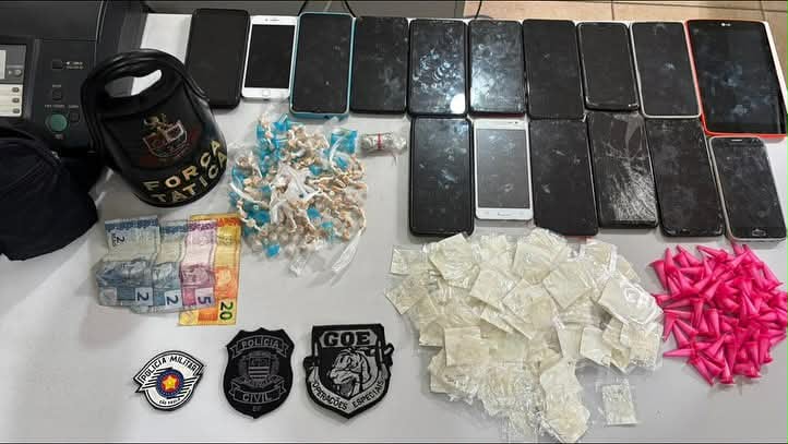 Foram cumpridos quatro mandados de busca e apreensão em endereços distintos na cidade de Conchas, resultando na prisão em flagrante de diversos indivíduos e na apreensão de expressiva quantidade de drogas, dinheiro e objetos relacionados à traficância.