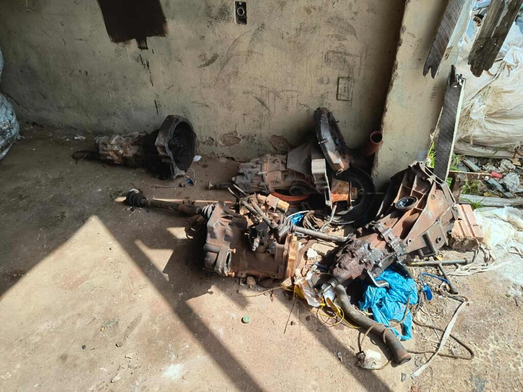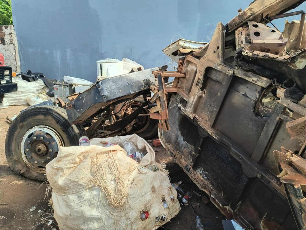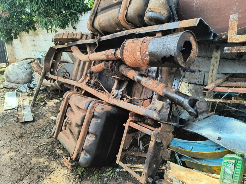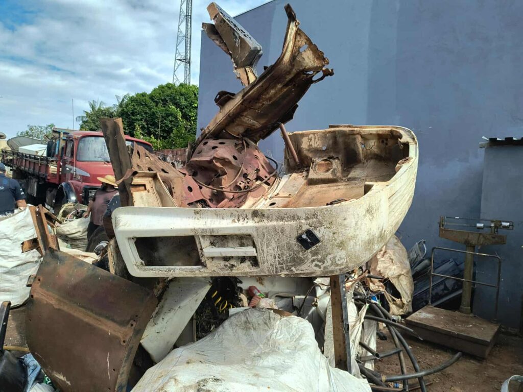 Em um dos locais fiscalizados, foram identificadas diversas partes de caminhões e automóveis — entre elas chassis, cabines, motores e câmbios — desmontadas de maneira irregular e sem autorização do órgão competente.