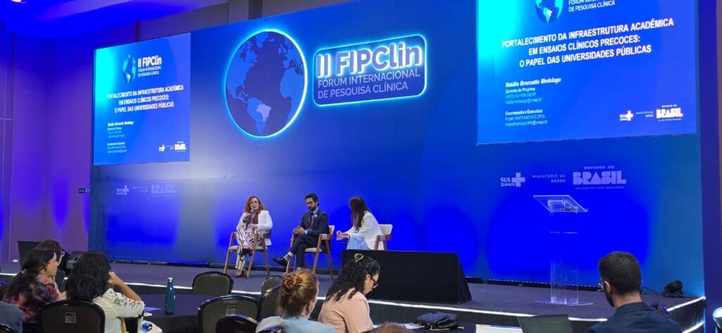 A convite da organização, a gerente de projetos da UPECLIN-FMB/UNESP, Natália Bronzatto Medolago palestrou sobre o fortalecimento da infraestrutura acadêmica para ensaios clínicos precoces, ressaltando o papel das universidades públicas e a importância de um ambiente institucional robusto para o desenvolvimento e condução de estudos clínicos em fases iniciais (fases I e II).