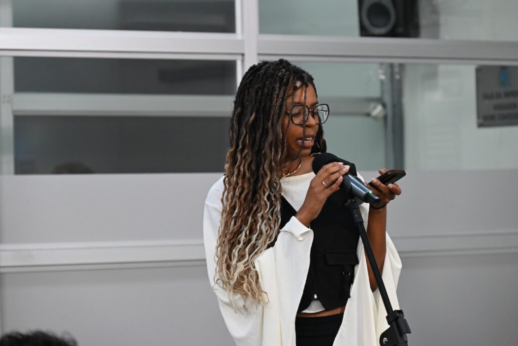 Na Mesa dos trabalhos, estavam os vereadores Lelo Pagani e Welinton Japa (MDB); a integrante do Grupo de Mulheres Negras de Botucatu “Tereza de Benguela” e multiplicadora da Politize, Conceição Aparecida Domingos Vercesi; a estudante de Pedagogia e responsável pelo projeto Jardim Amarelo, Carolina Narciso Pereira dos Santos; e o coordenador do Projeto Supera, Juberto Galdino.