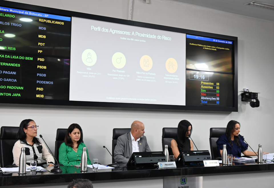 Após solicitação do Conselho Municipal dos Direitos da Criança e do Adolescente (Cmdca), e convocação pela Mesa Diretora da Câmara Municipal de Botucatu, o Legislativo realizou na noite desta quinta-feira, dia 26 de fevereiro, uma Audiência Pública para discutir a Campanha contra a Violência Infantil.